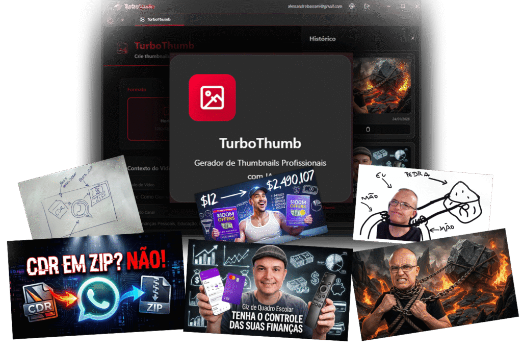 O TurboThumb é flexível. Use as thumbnails direto nele ou copie o prompt e gere imagens em outras IAs.